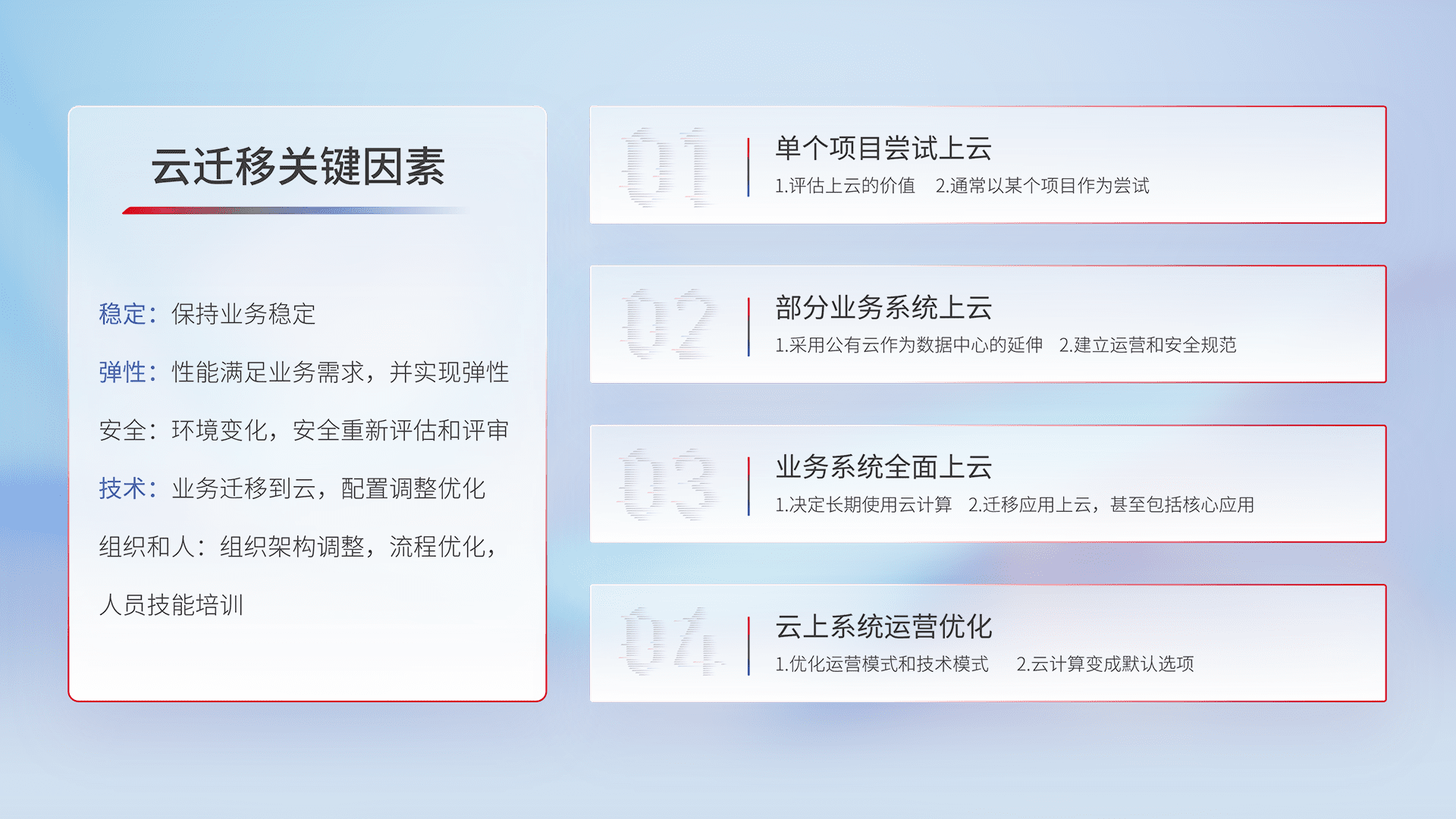 结合实际业务,,,从规划设计、、、、云平台选型、、、、云原生改造、、、、数据迁移、、、集成交付,,迁移全过程为客户识别最佳上云路径,,,,做好风险识别管理,,,,设计网络架构、、、身份权限、、、、安全审计合规、、操作审计、、、日志审计、、、、监控告警策略、、、、多站点容灾设计等,,,对云上基础设施进行整体规划,,,,提升IT治理水平,,,,以满足弹性、、、、高可用、、、高性能的需求。。。